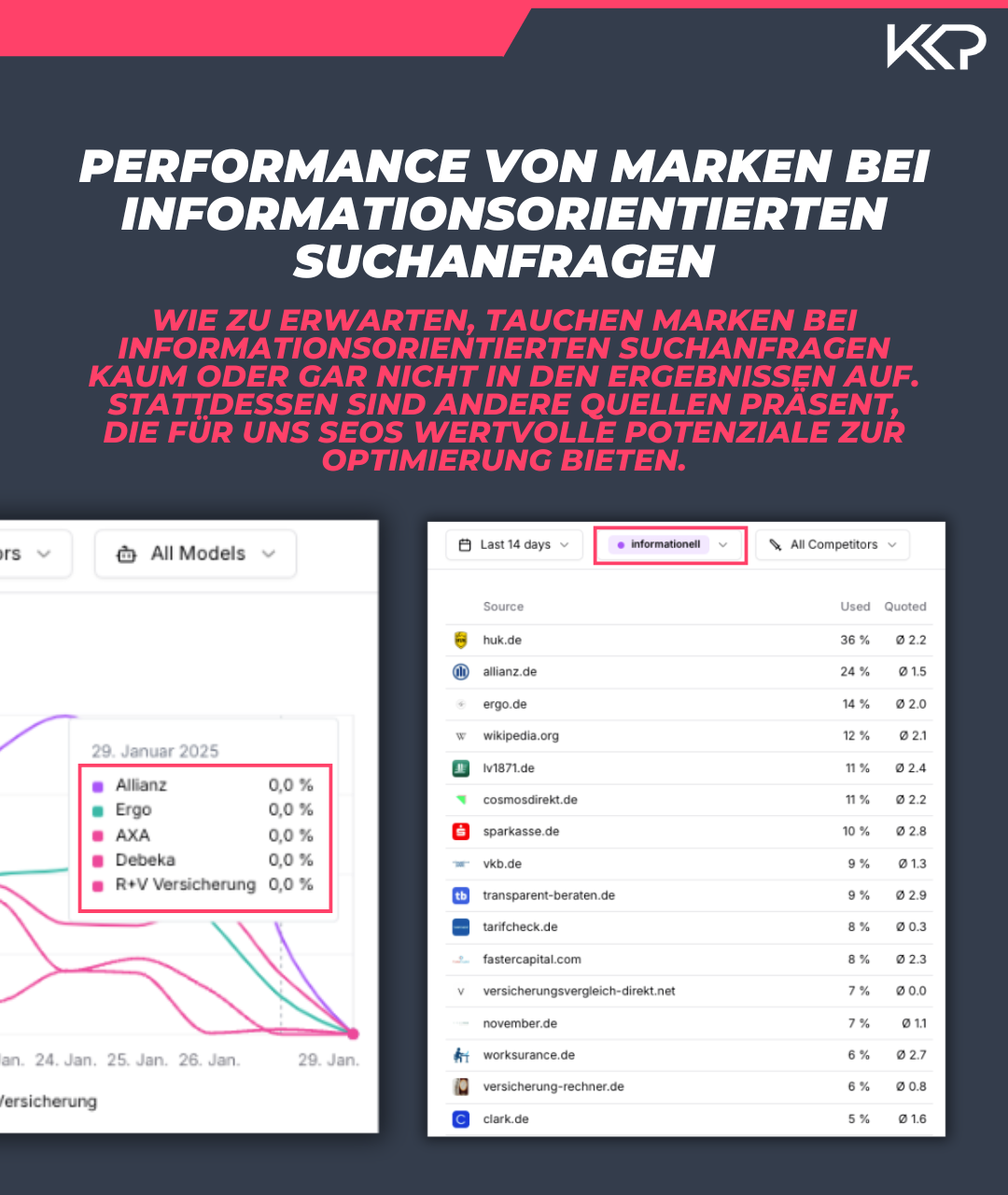 - Einige Marken haben eine hohe Eigenpräsenz als Quelle (z. B. HUK).